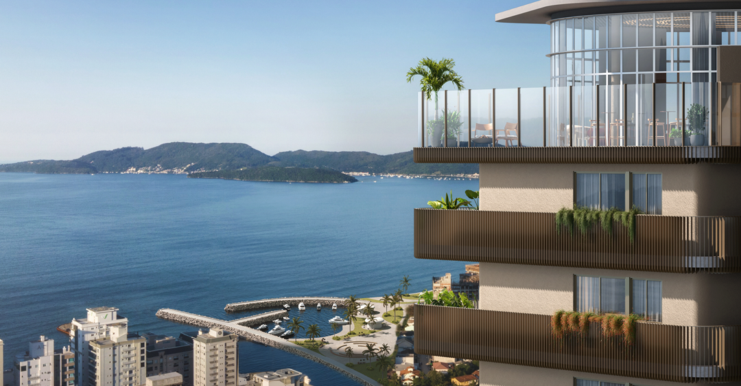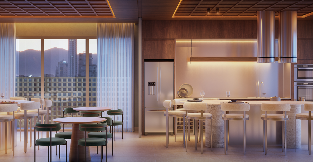 O guarda corpo, desenhado como um detalhe único, abraça a viga de borda e enriquece a composição visual. Além disso, a arquitetura do Orgânica traz uma divisão marcada entre áreas sociais e íntimas dos apartamentos que reforça a busca pela sensação de casa mesmo em um empreendimento tão verticalizado.